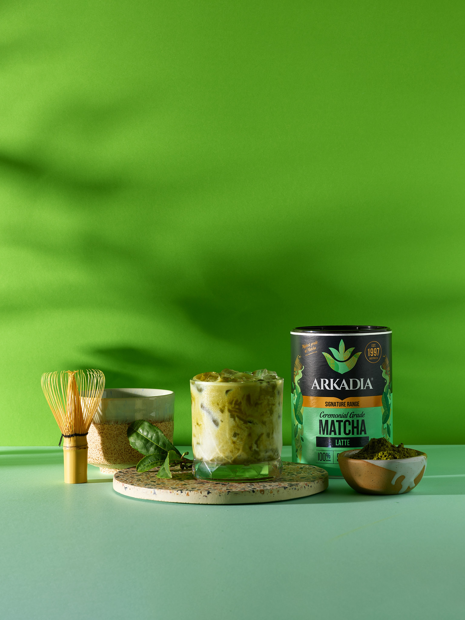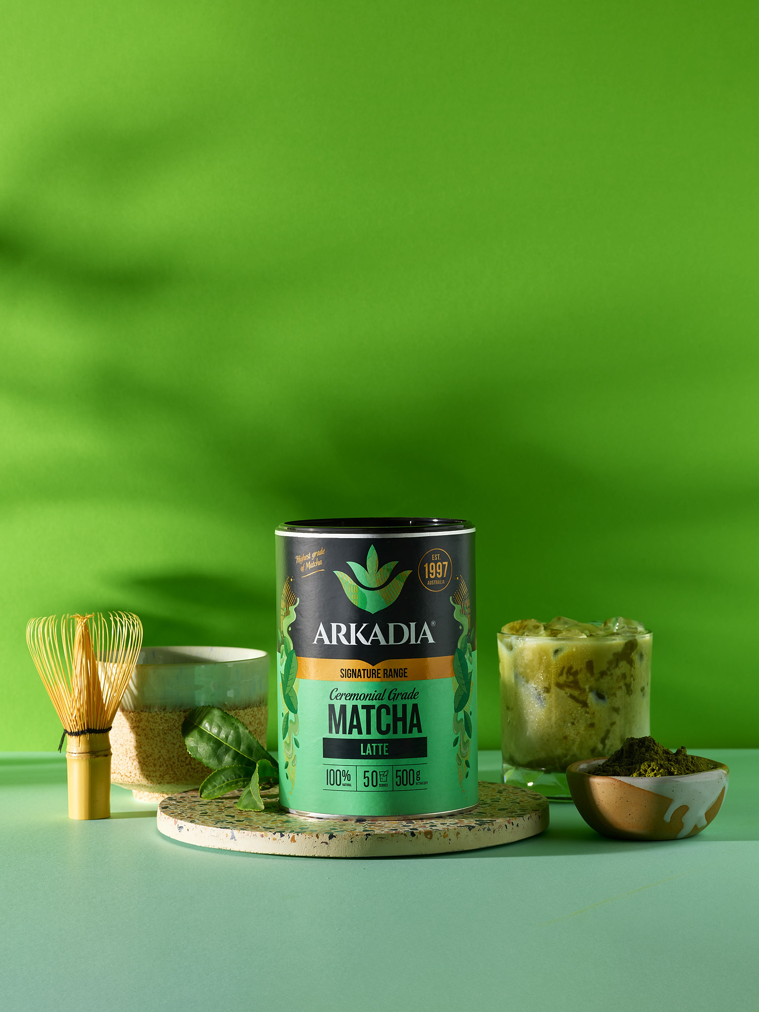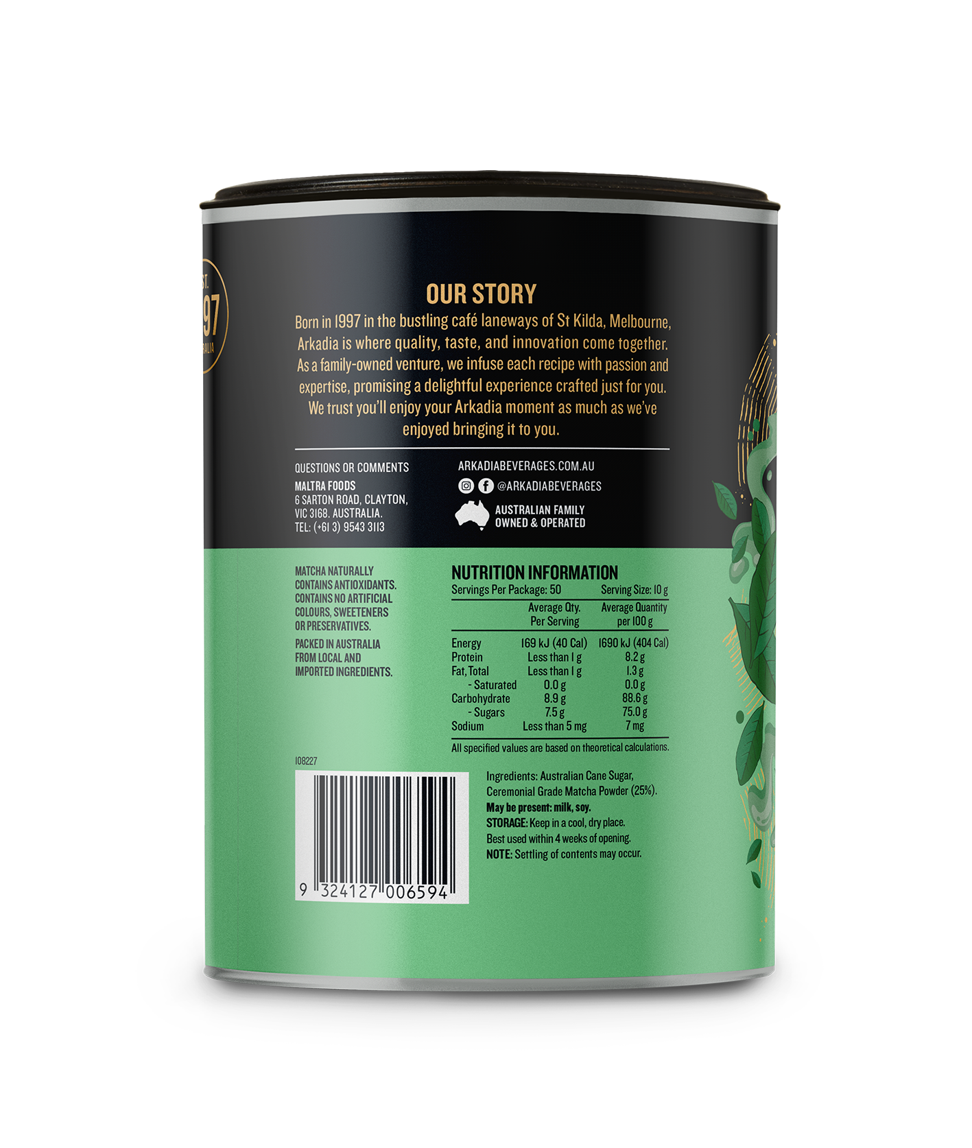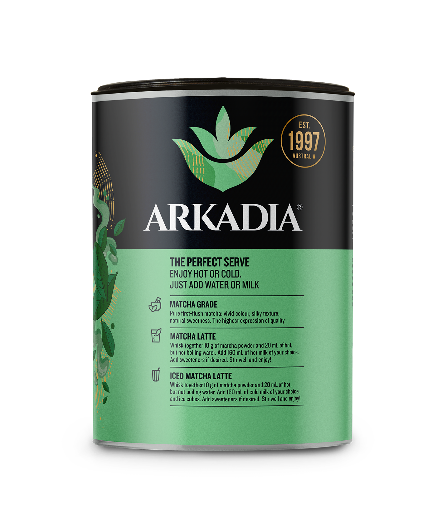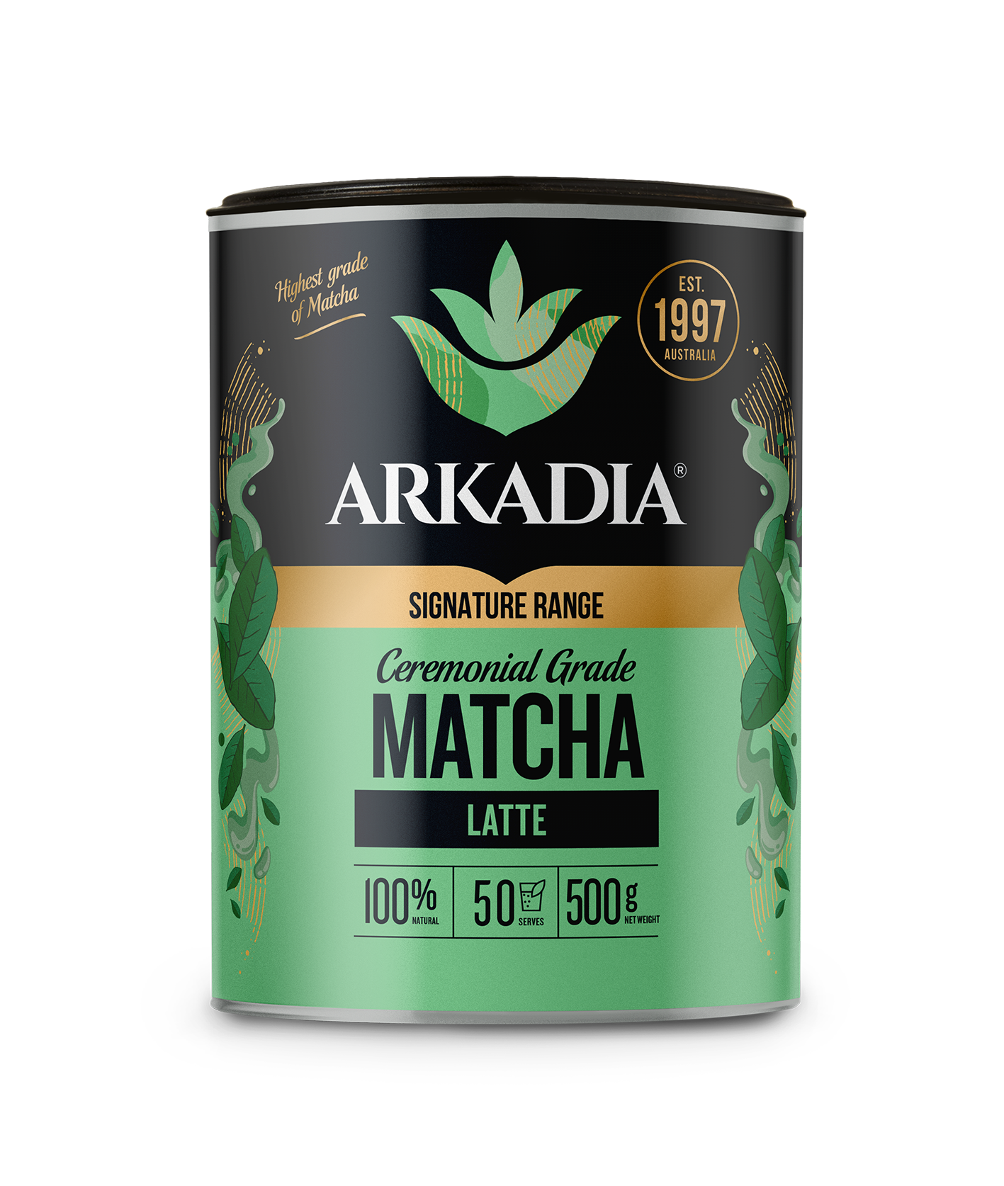Elevate every sip with Arkadia Ceremonial Grade Matcha Latte — a luxurious blend crafted with pure first-flush matcha for a premium, refined drinking experience. This blend delivers a vibrant green colour, delicate natural sweetness, and an exceptionally smooth texture.